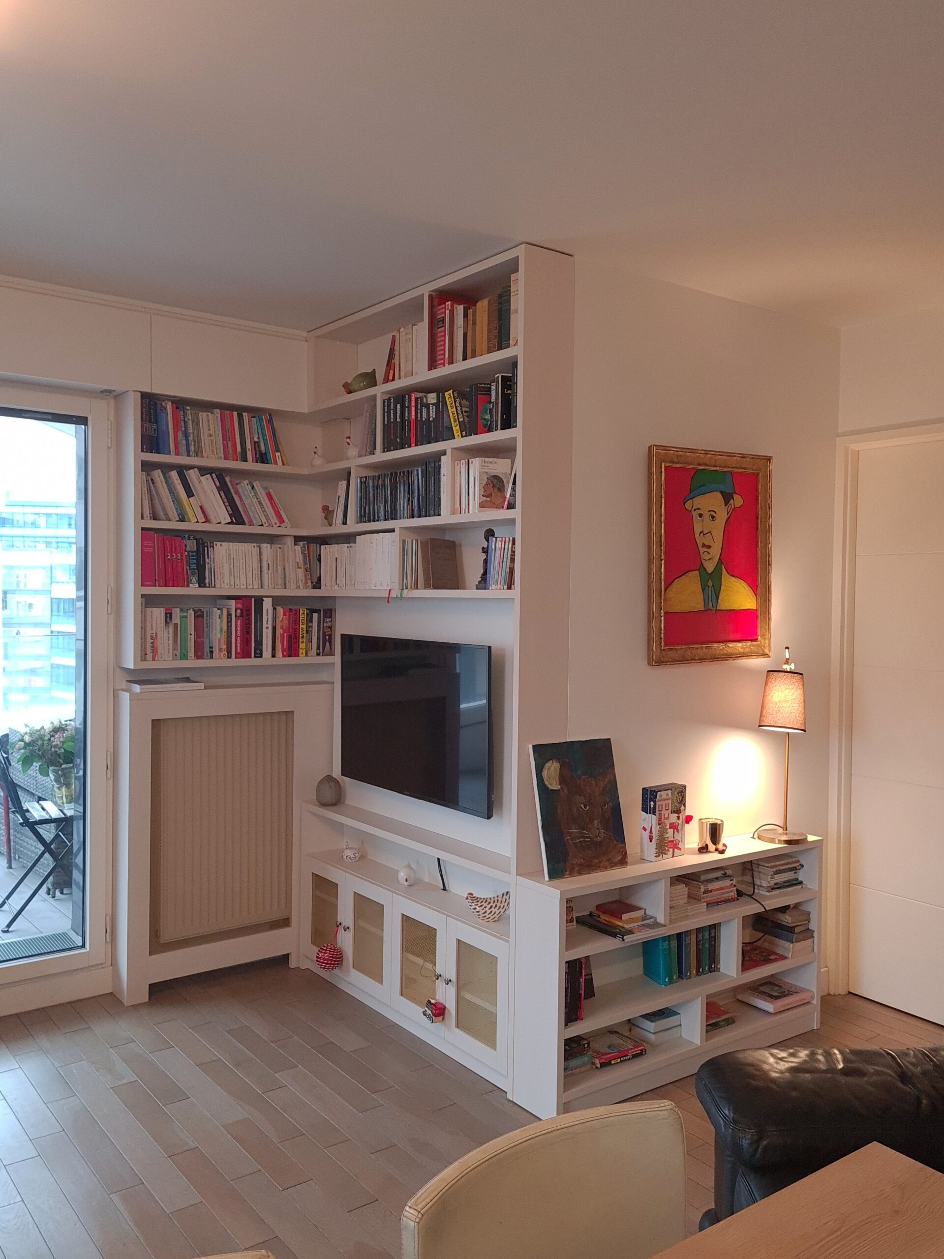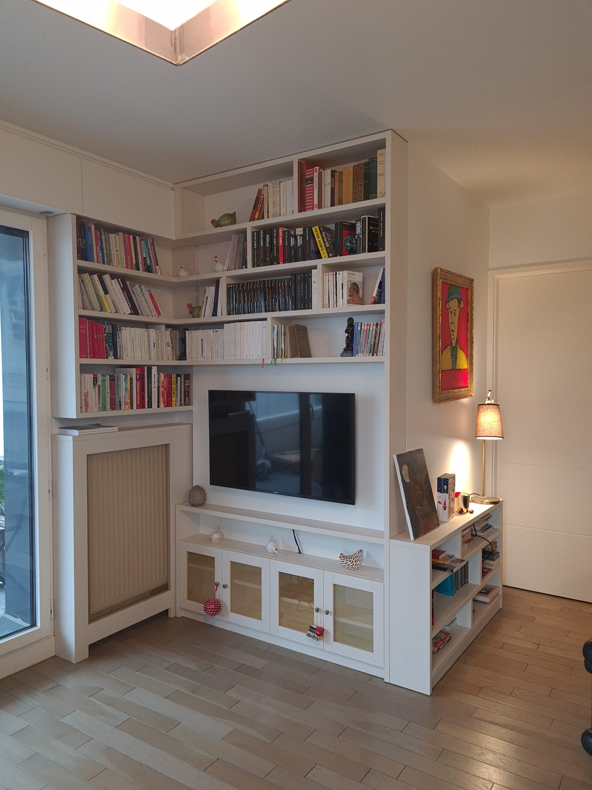 Réalisation d’un meuble TV avec bibliothèque filante dans un angle du sejour avec prise en compte de l’espace et du radiateur par un cache similaire aux portes du meuble TV