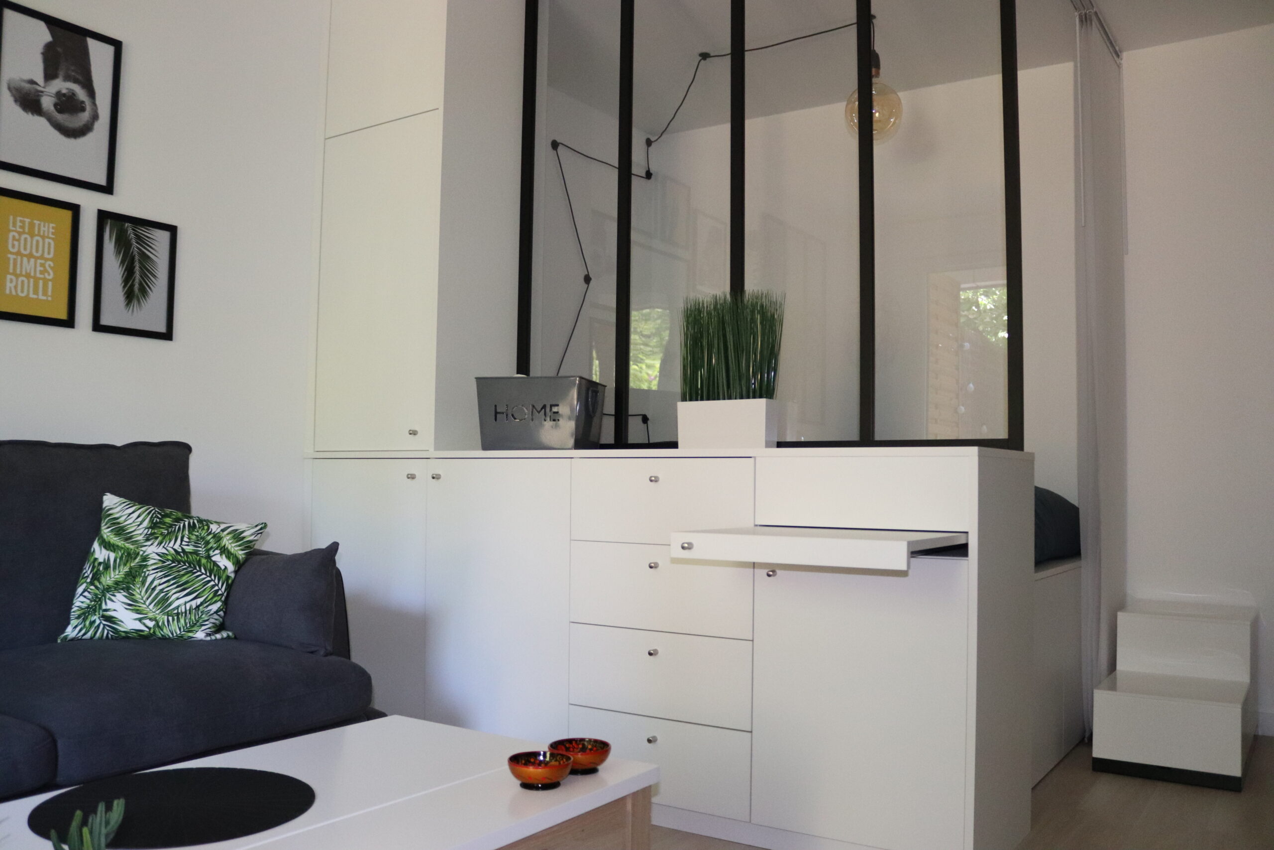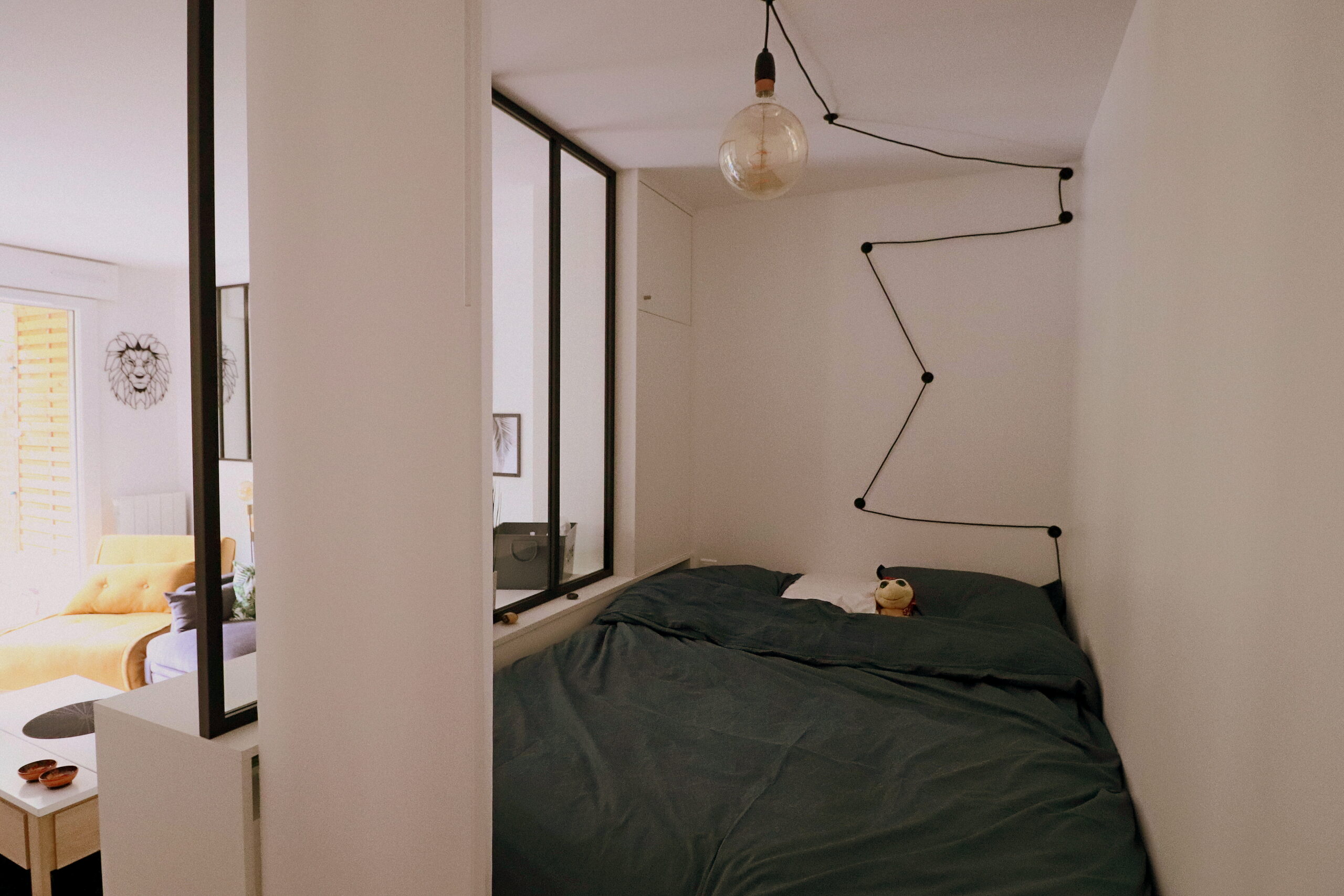 Pour optimiser l’espace, J’ai dessiné des meubles sur mesure et créer le super coin nuit réhaussé avec une verrière et beaucoup de rangements