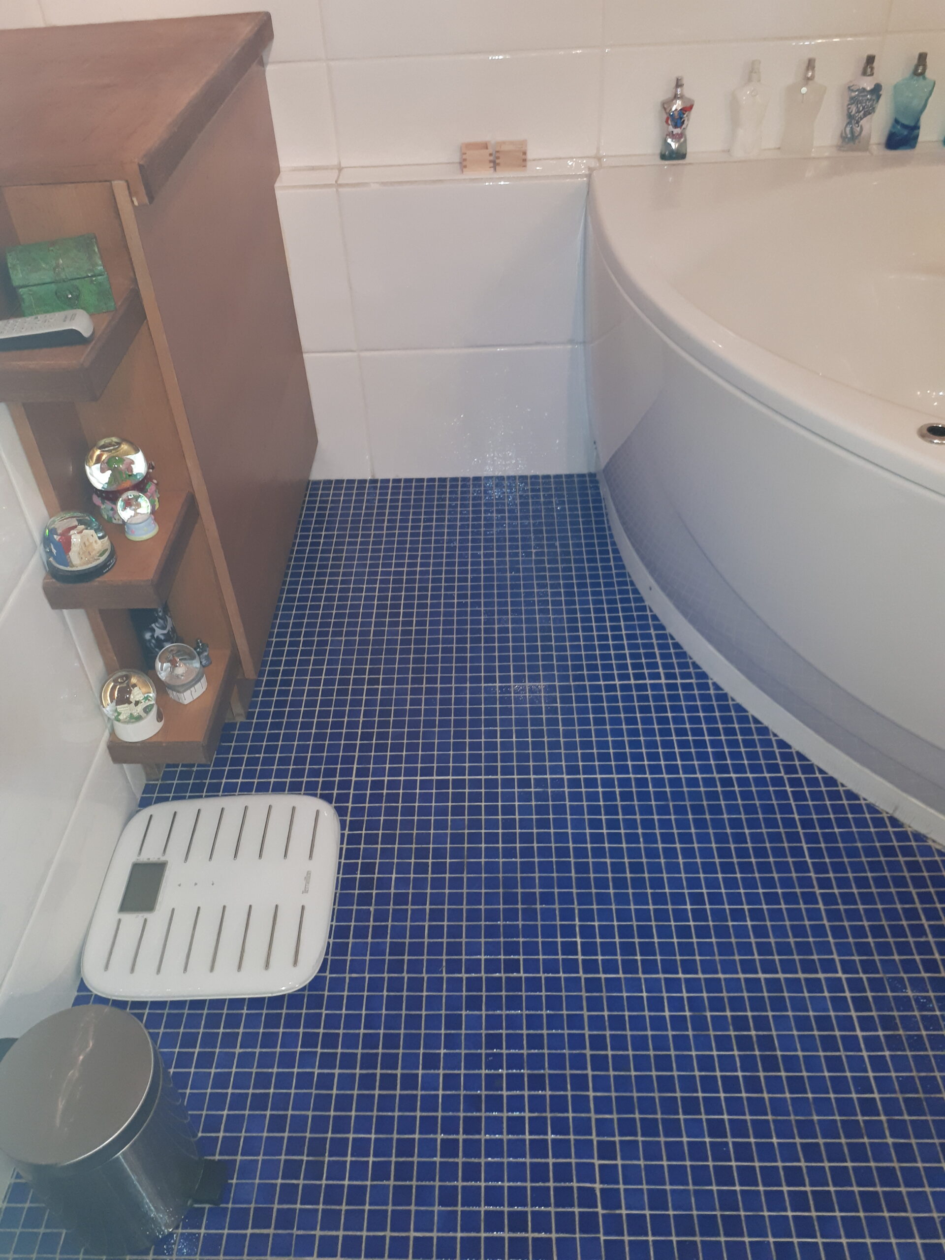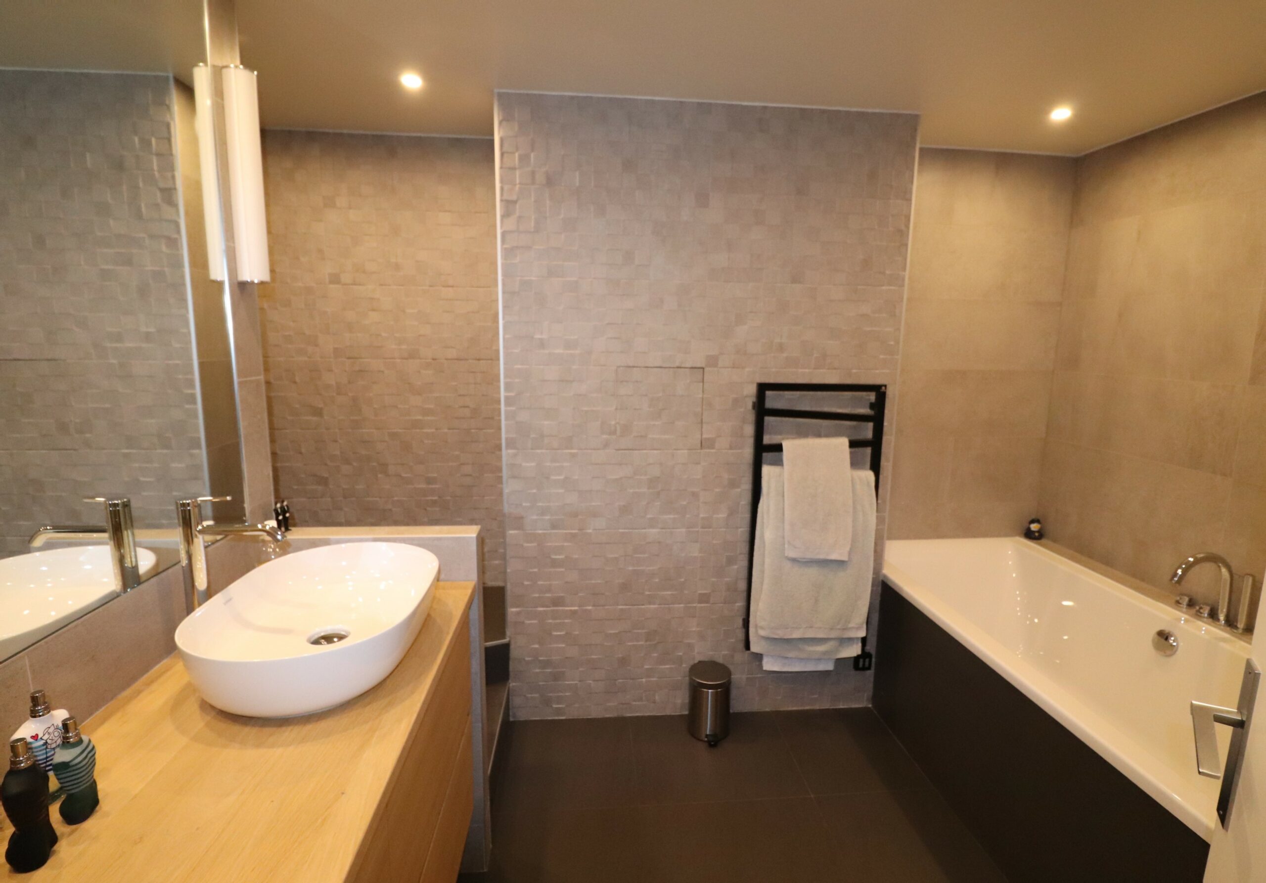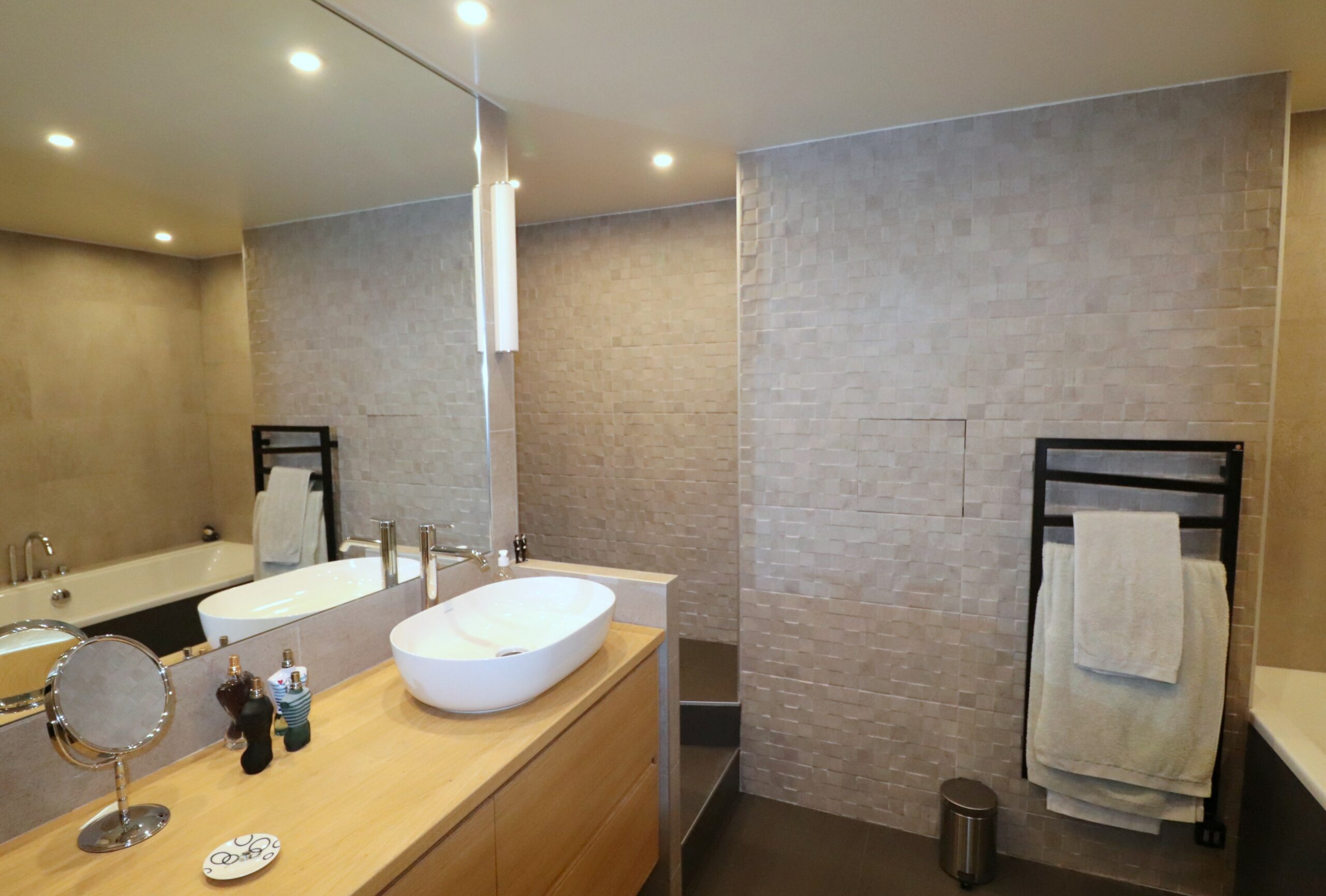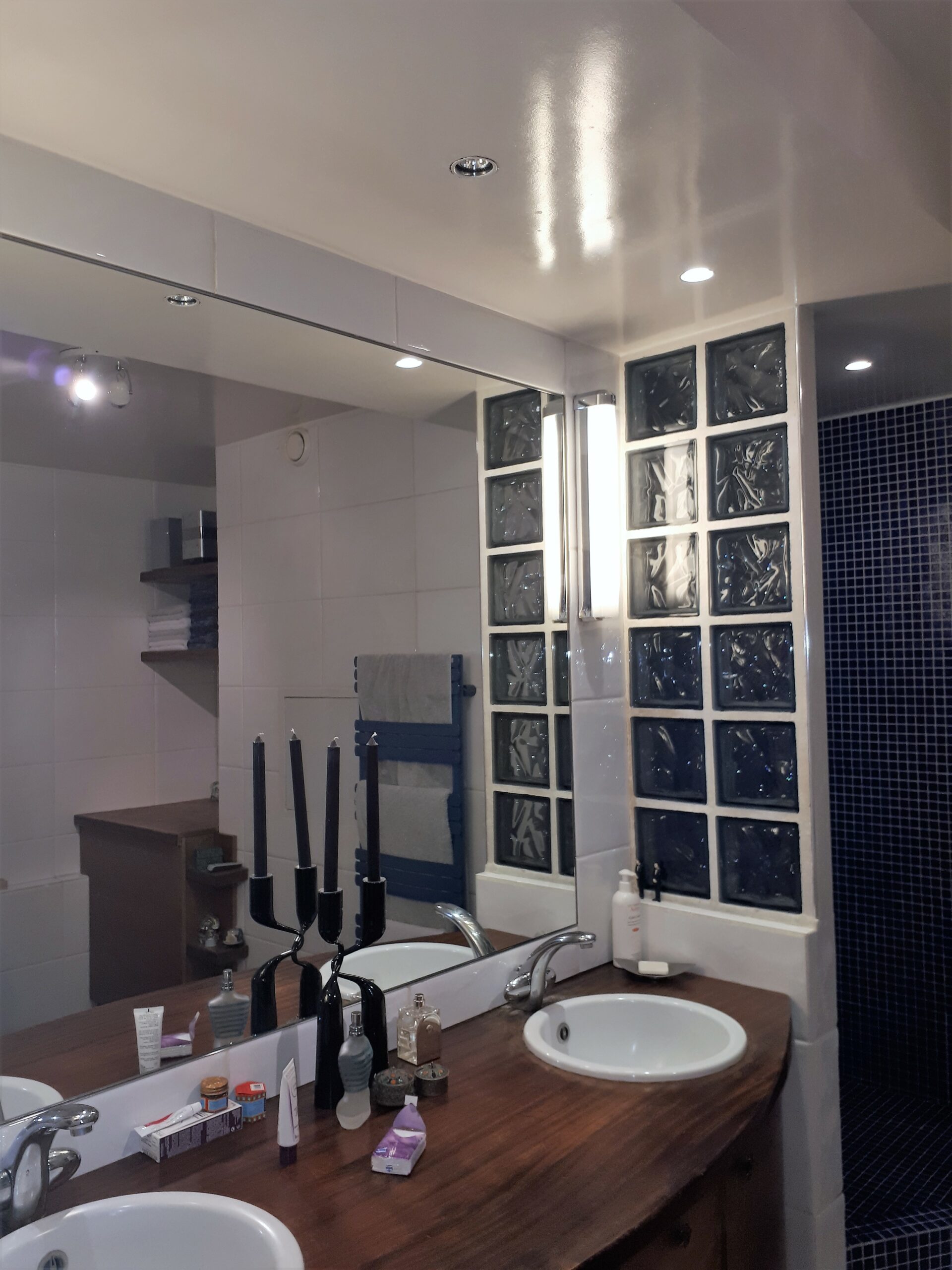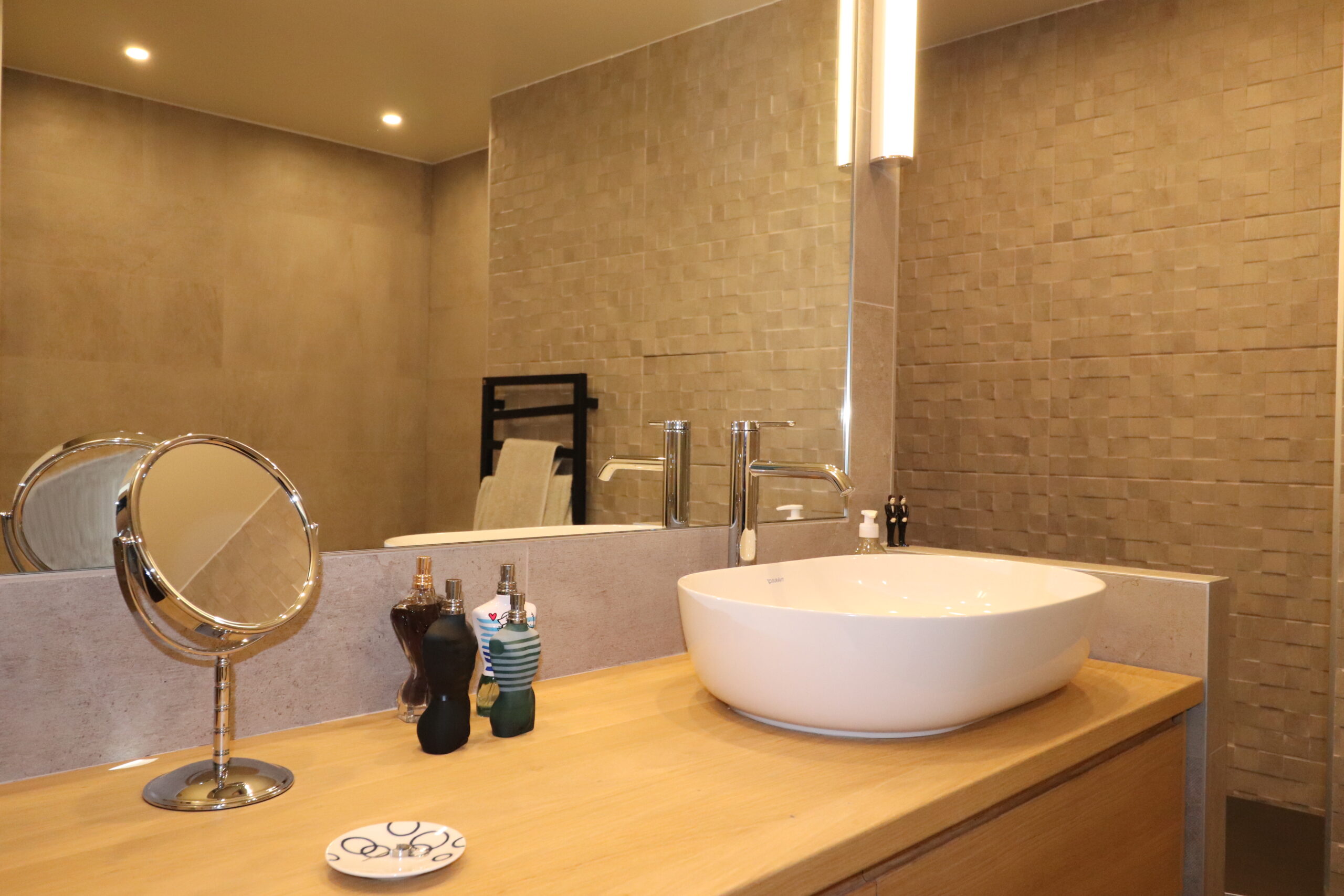 Le mobilier sur mesure crée par mon artisan menuisier ébéniste donne une véritable valeur ajoutée aux espaces : le meuble vasque de la salle de bain illumine les murs en mosaïque de chez PORCELANOSA.