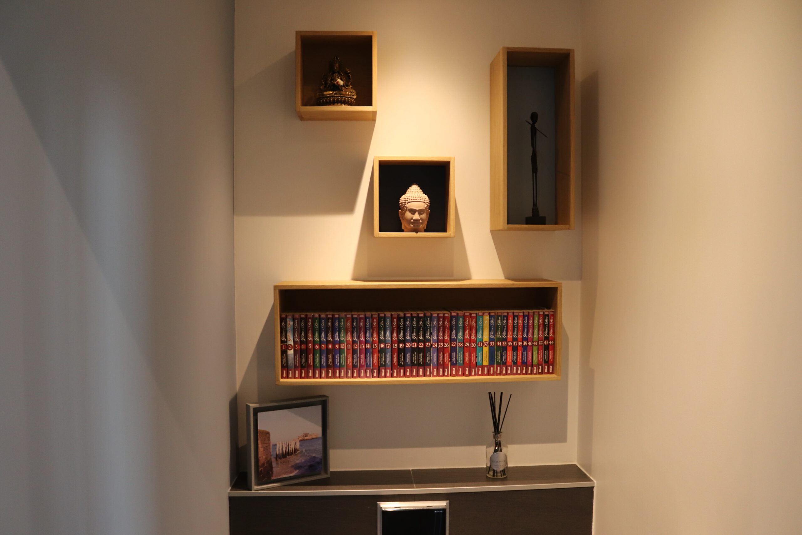 Le jeux des étagères cubes dans le WC donne un air très chic à cet espace