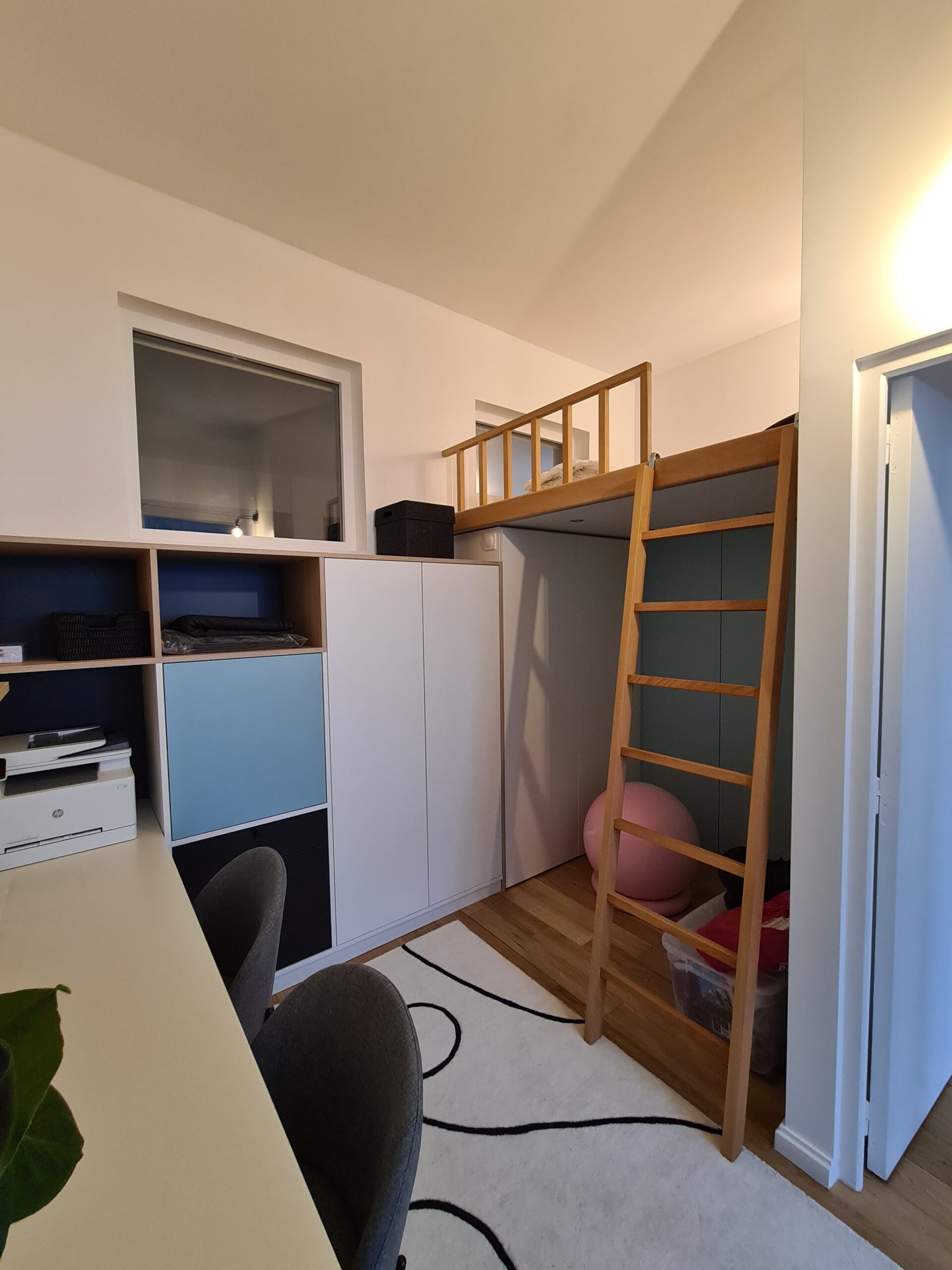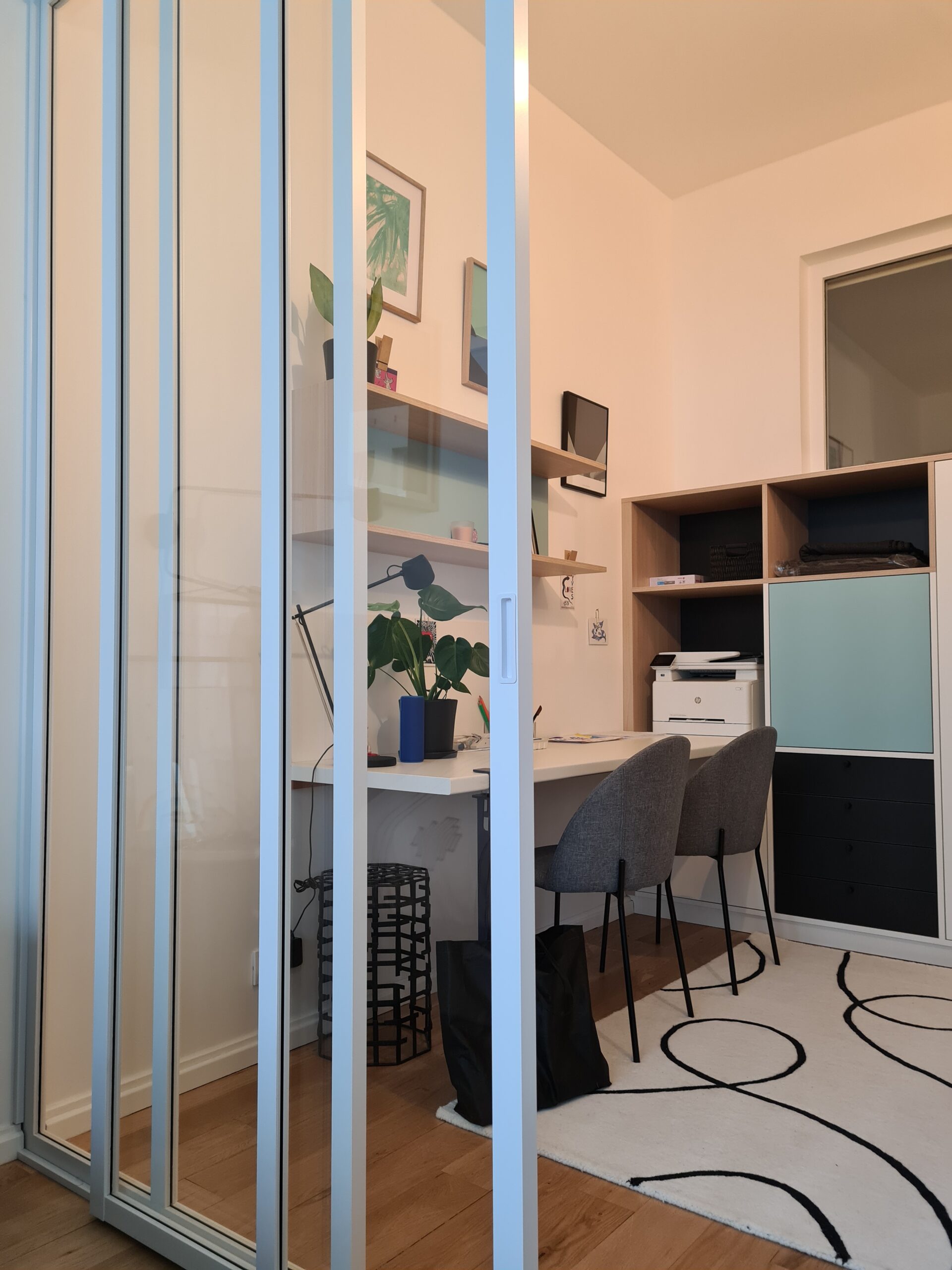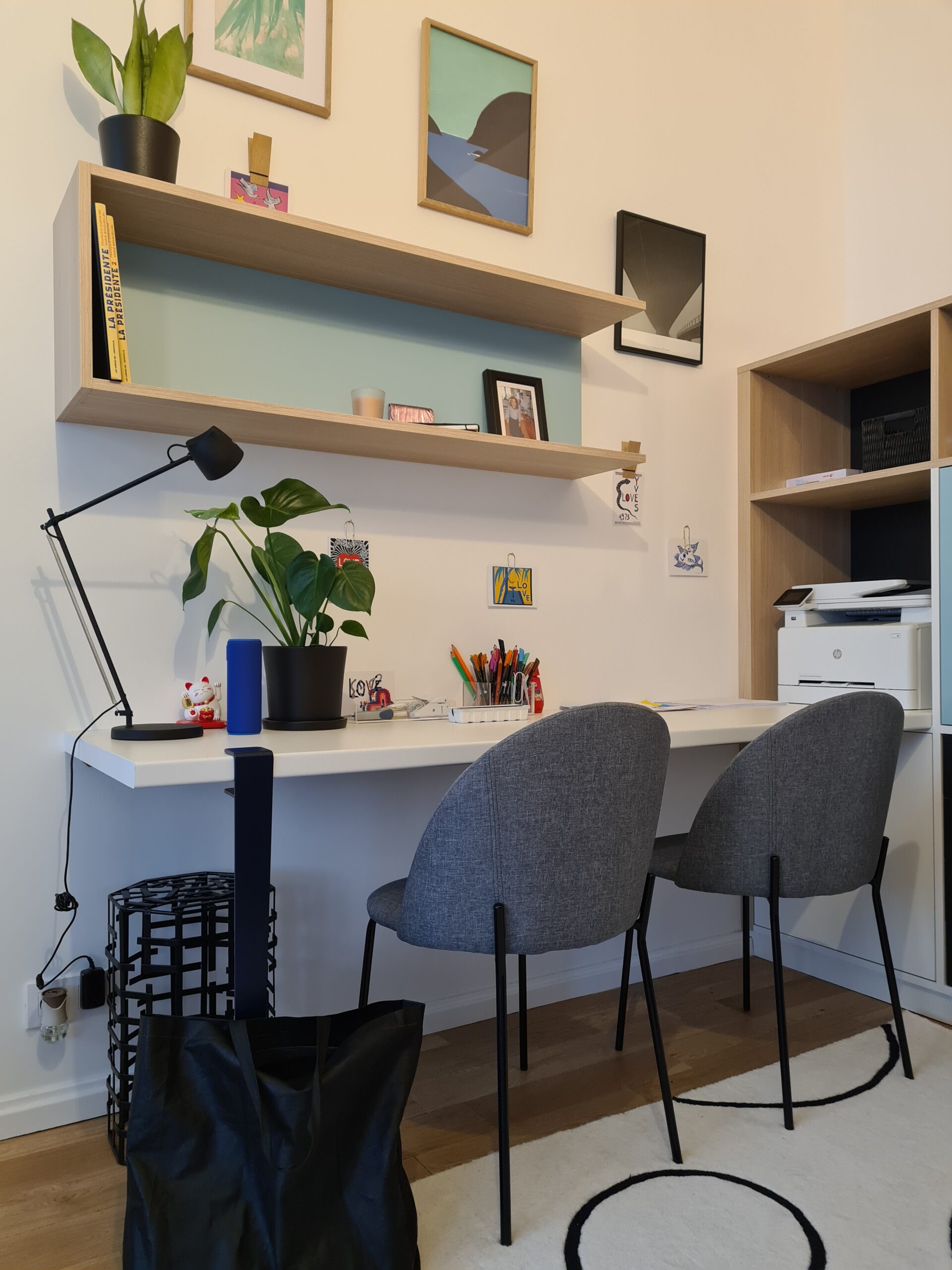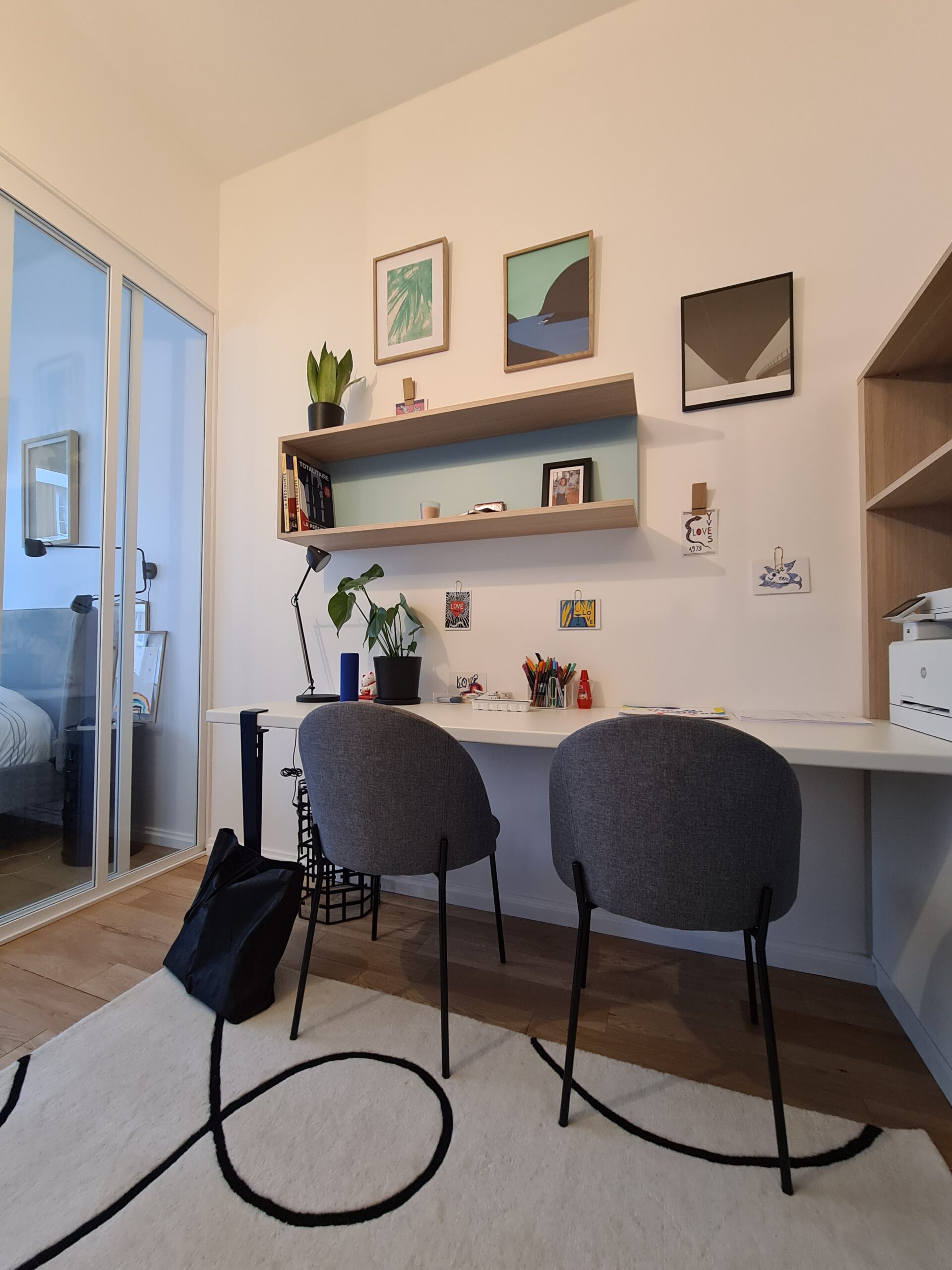 Travail avec mon artisan tous corps d’état ainsi qu’avec mon menuisier pour la réalisation des meubles dessinés par mes soins dont la zone bureau