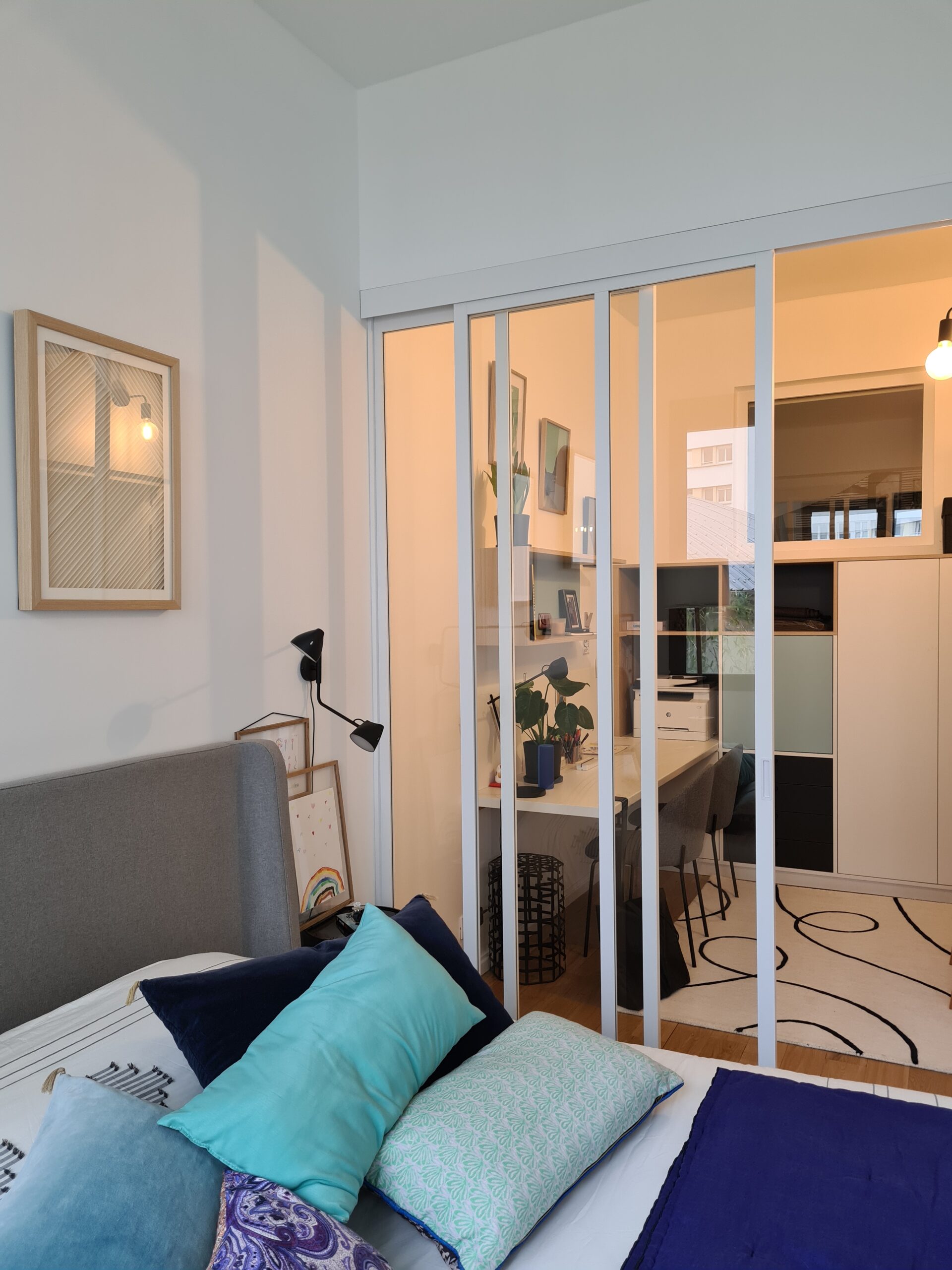 Communication de l’espace nuit parental avec une chambre d’amis-bureau . Liaison avec une double porte verrière coulissante